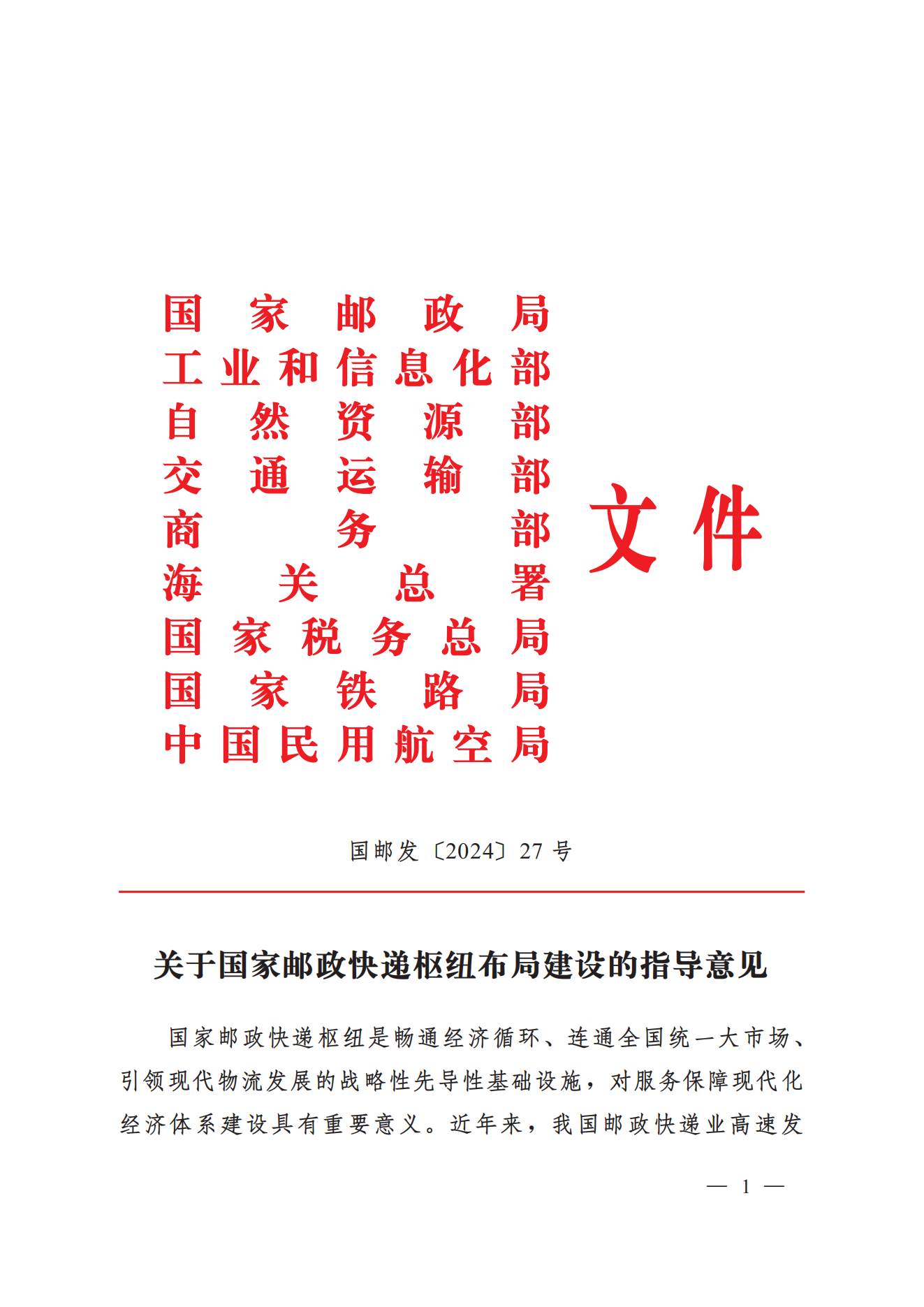 关于国家邮政快递枢纽布局建设的指导意见(国邮发〔2024〕27号).pdf