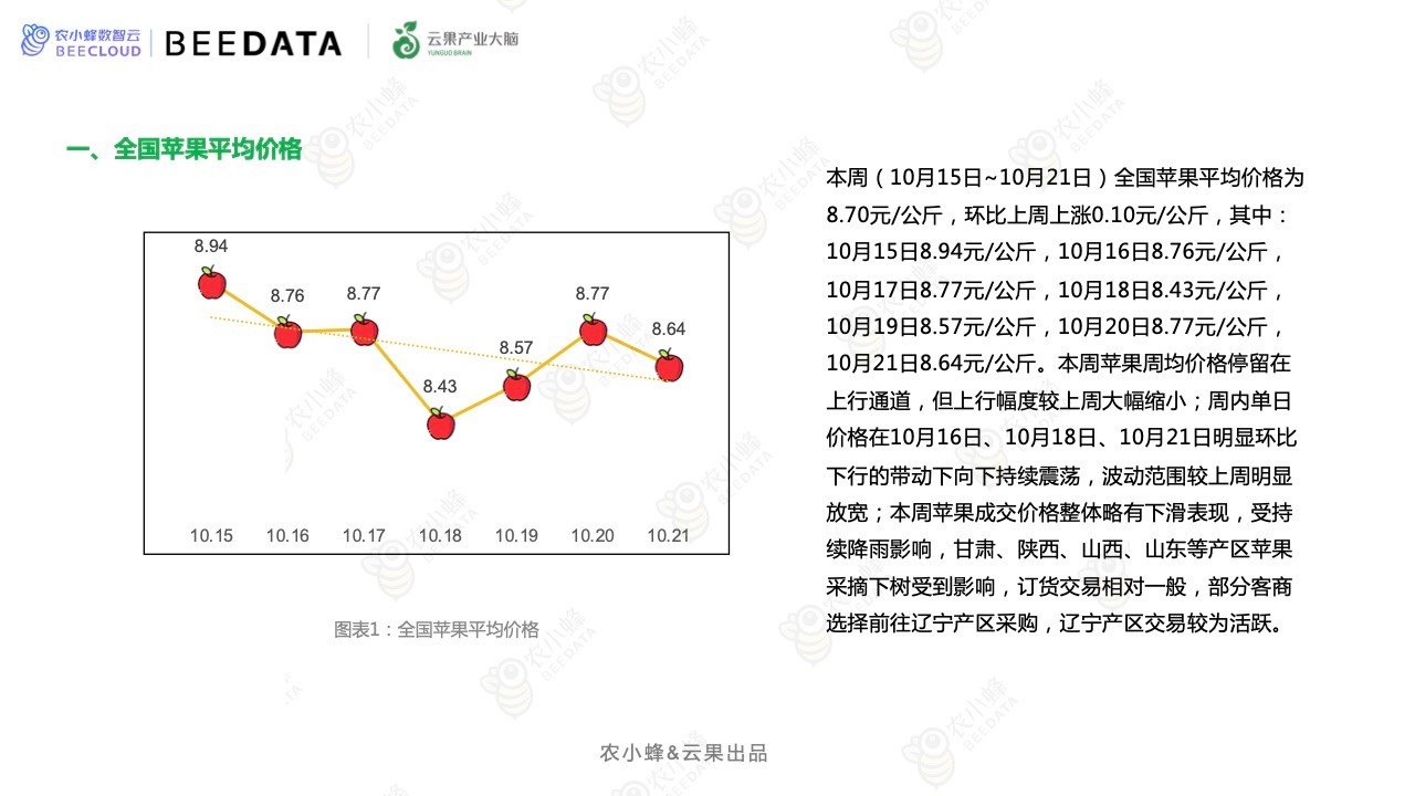 本周(10月15日~10月21日)全国苹果平均价格为8.70元/公斤,环比上周上涨0.10元/公斤,本周苹果周均价格停留在上行通道,但上行幅度较上周大幅缩小;