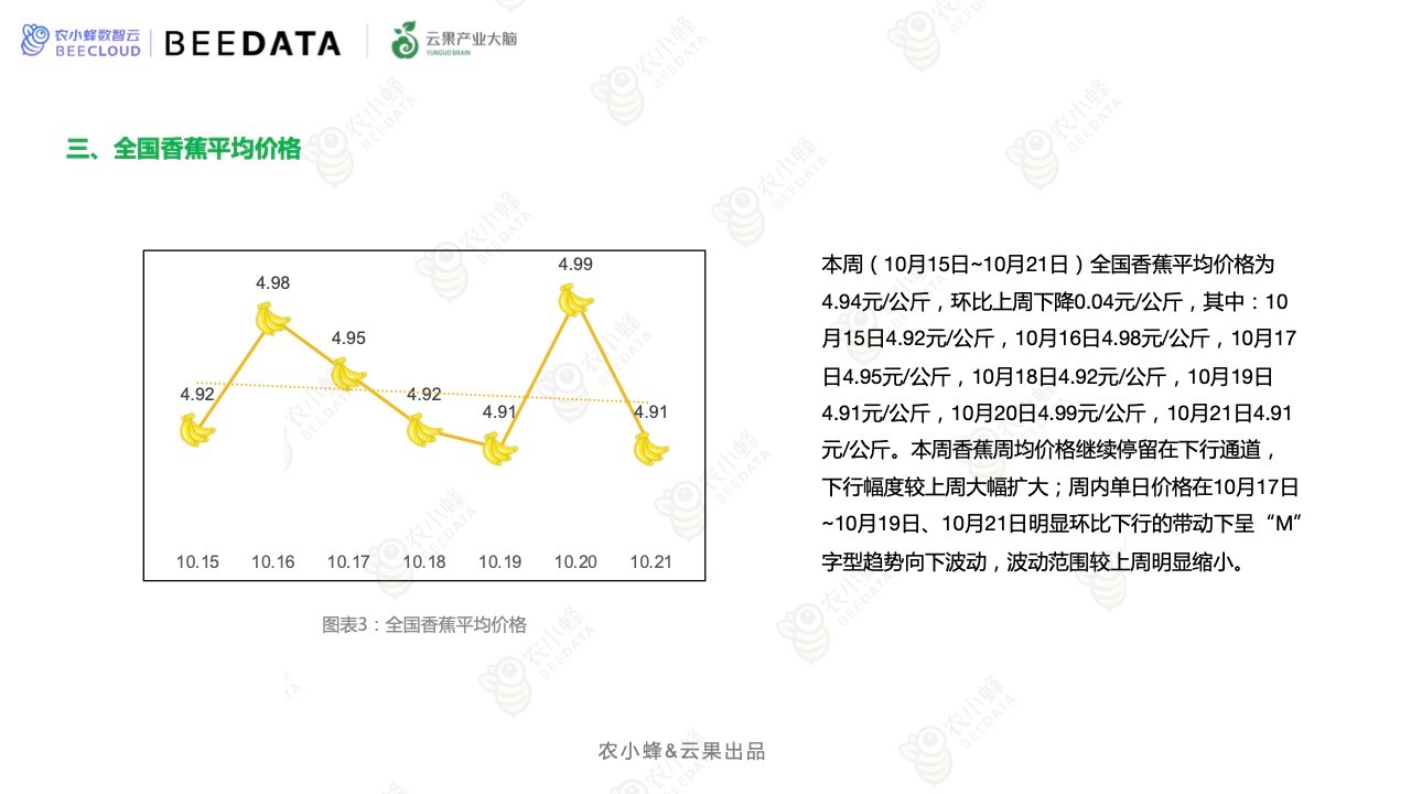 本周(10月15日~10月21日)全国香蕉平均价格为4.94元/公斤,环比上周下降0.04元/公斤,本周香蕉周均价格继续停留在下行通道,下行幅度较上周大幅扩大;