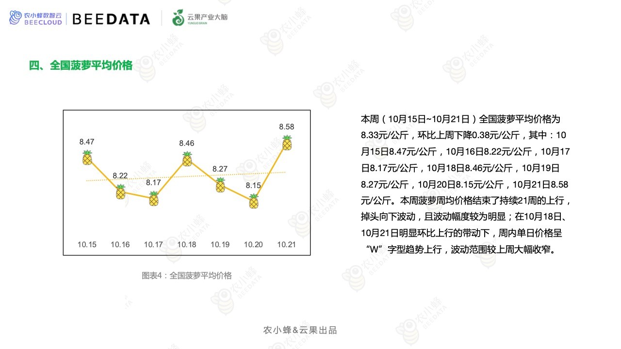 本周(10月15日~10月21日)全国菠萝平均价格为8.33元/公斤,环比上周下降0.38元/公斤,本周菠萝周均价格结束了持续21周的上行,掉头向下波动,且波动幅度较为明显;
