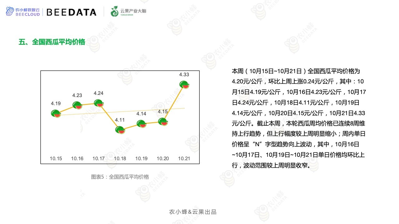 本周(10月15日~10月21日)全国西瓜平均价格为4.20元/公斤,环比上周上涨0.24元/公斤,截止本周,本轮西瓜周均价格已连续8周维持上行趋势,但上行幅度较上周明显缩小。