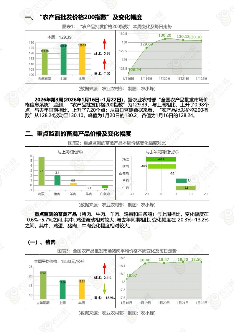 2026年第3周(2026年1月16日~1月22日),据农业农村部“全国农产品批发市场价格信息系统”监测,“农产品批发价格200指数”为129.39,与上周相比,上升了0.98个点;与去年同期相比,上升了7.20个点;从每日监测数据来看,“农产品批发价格200指数”从128.24波动至130.10,峰值为1月20日的130.2,谷值为1月16日的128.24。