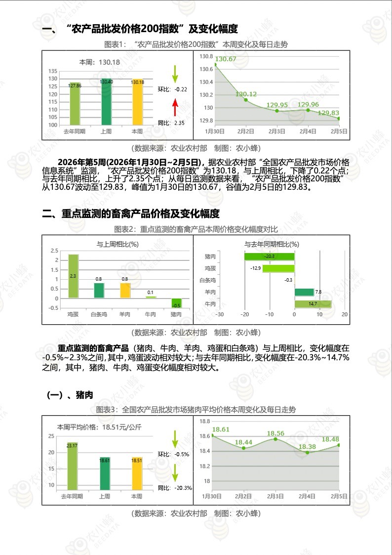 2026年第5周(2026年1月30日~2月5日),据农业农村部“全国农产品批发市场价格信息系统”监测,“农产品批发价格200指数”为130.18,与上周相比,下降了0.22个点;与去年同期相比,上升了2.35个点;从每日监测数据来看,“农产品批发价格200指数”从130.67波动至129.83,峰值为1月30日的130.67,谷值为2月5日的129.83。