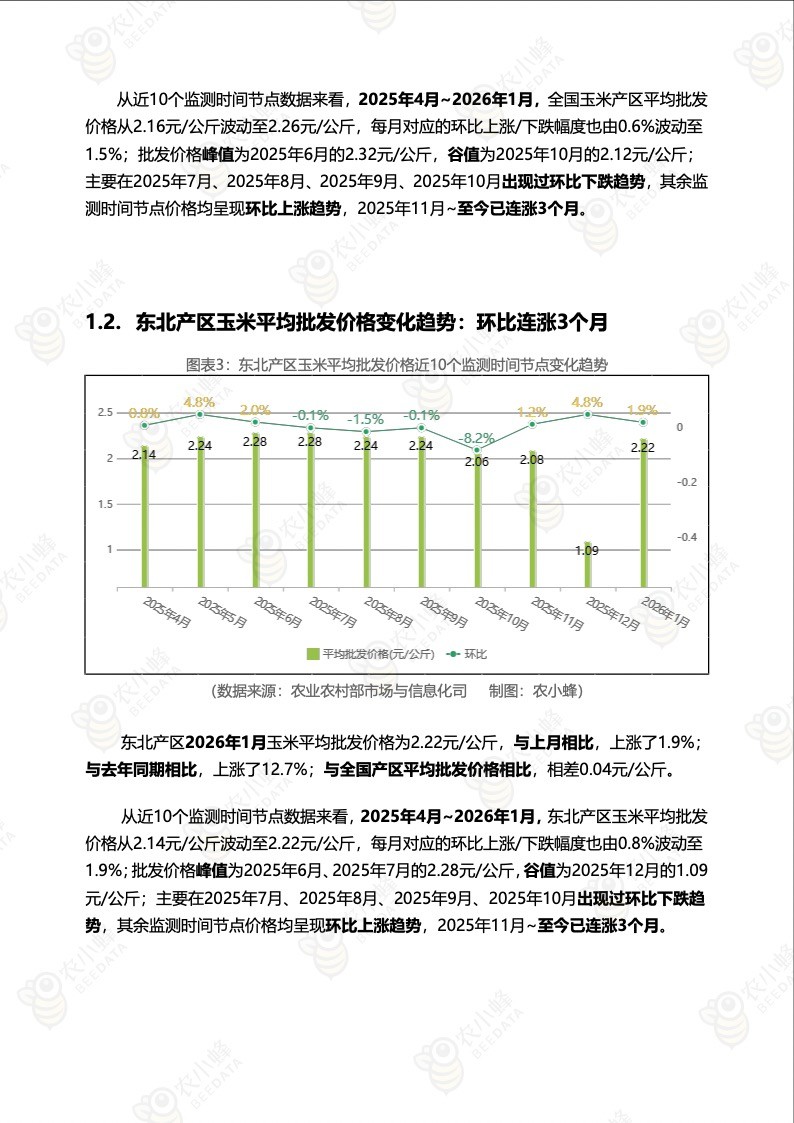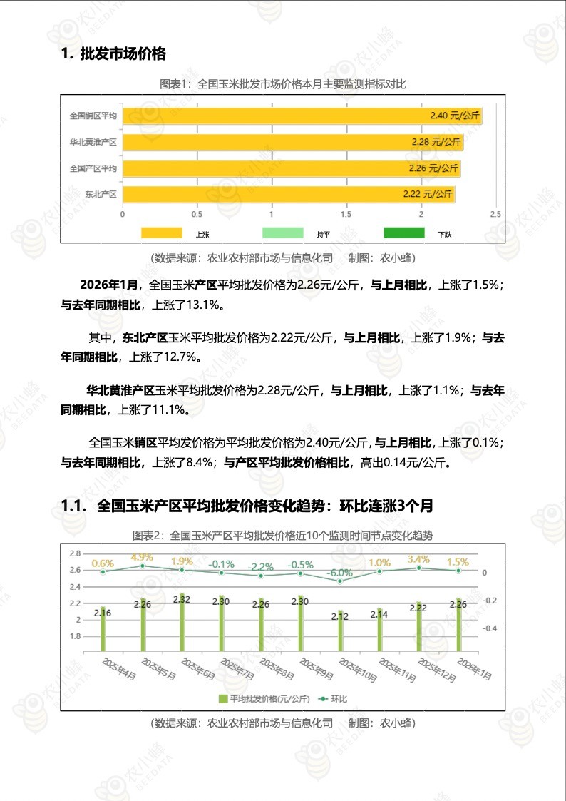 2026年1月,全国玉米产区平均批发价格为2.26元/公斤,与上月相比,上涨了1.5%;与去年同期相比,上涨了13.1%。其中,东北产区玉米平均批发价格为2.22元/公斤,与上月相比,上涨了1.9%;与去年同期相比,上涨了12.7%。华北黄淮产区玉米平均批发价格为2.28元/公斤,与上月相比,上涨了1.1%;与去年同期相比,上涨了11.1%。