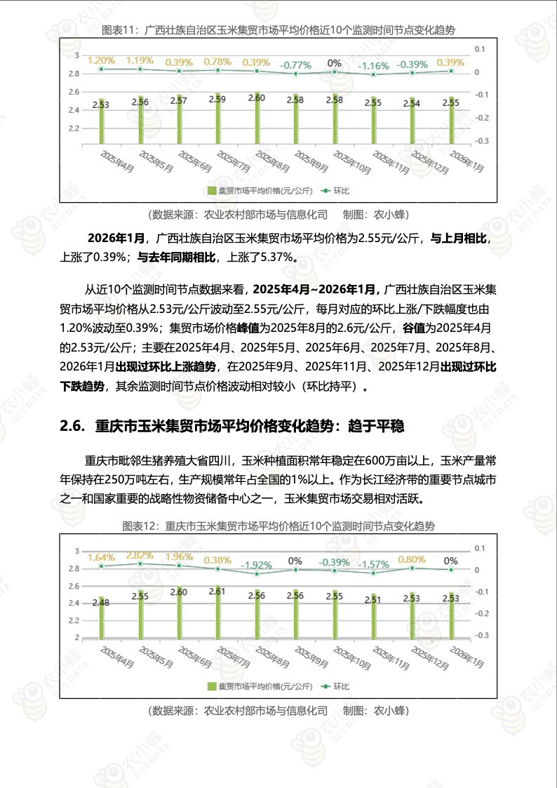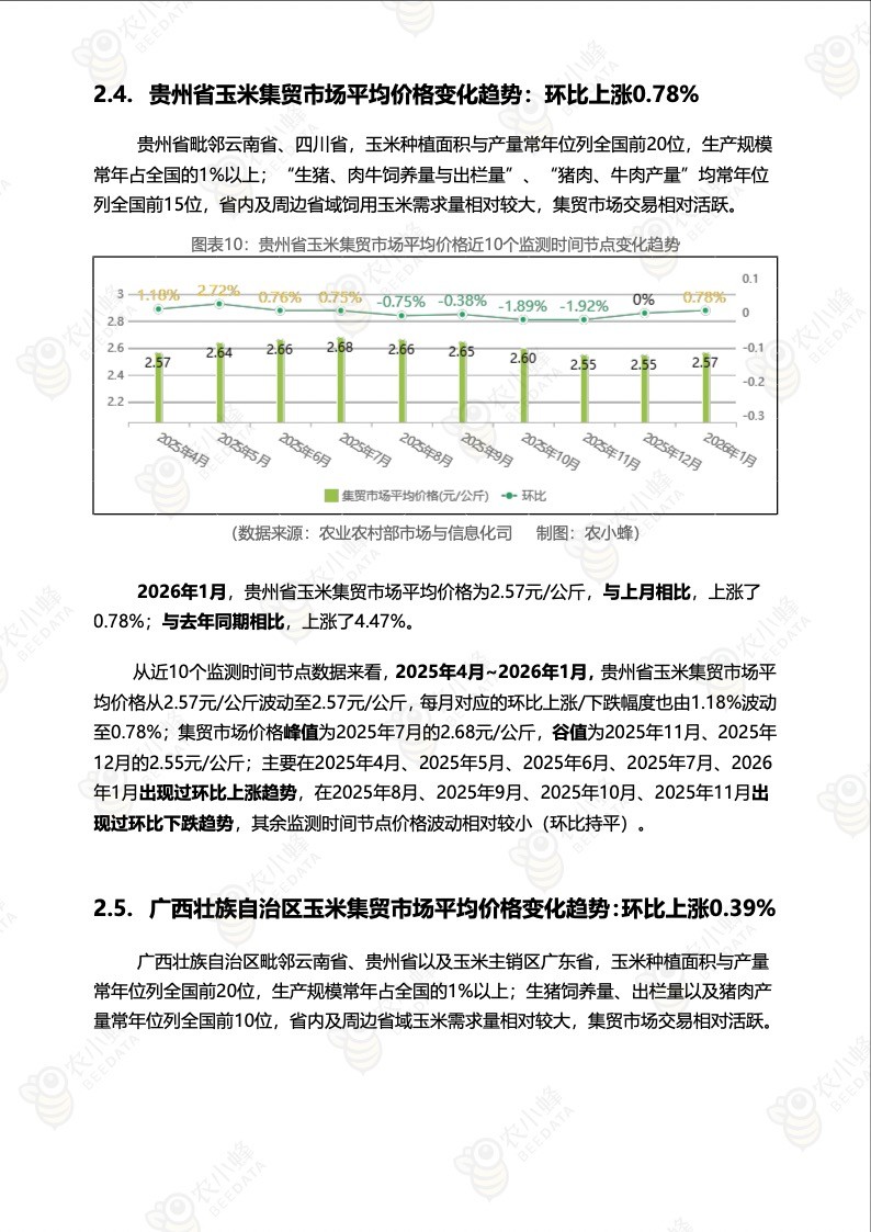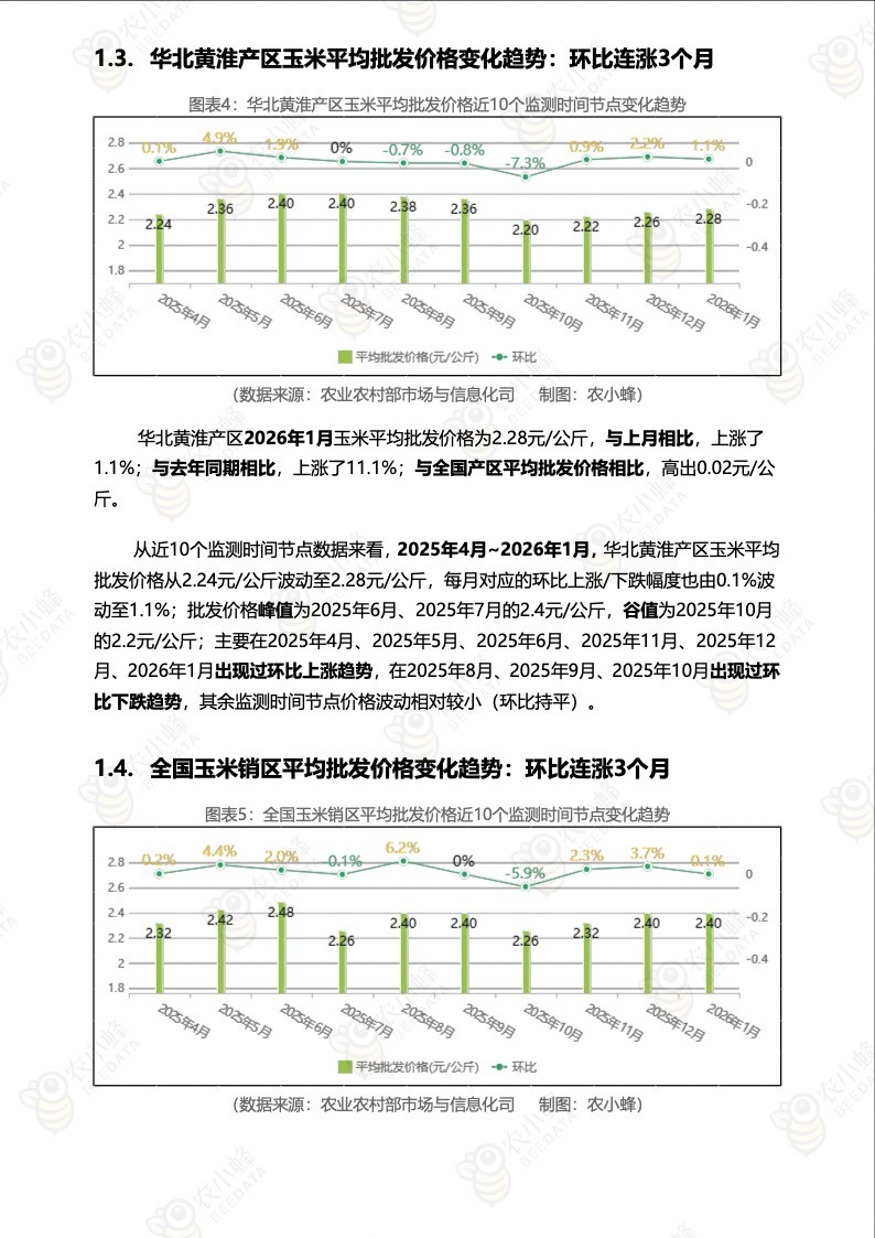 从近10个监测时间节点数据来看,2025年4月~2026年1月,全国玉米产区平均批发价格从2.16元/公斤波动至2.26元/公斤,每月对应的环比上涨/下跌幅度也由0.6%波动至1.5%;批发价格峰值为2025年6月的2.32元/公斤,谷值为2025年10月的2.12元/公斤;主要在2025年7月、2025年8月、2025年9月、2025年10月出现过环比下跌趋势,其余监测时间节点价格均呈现环比上涨趋势,2025年11月~至今已连涨3个月。