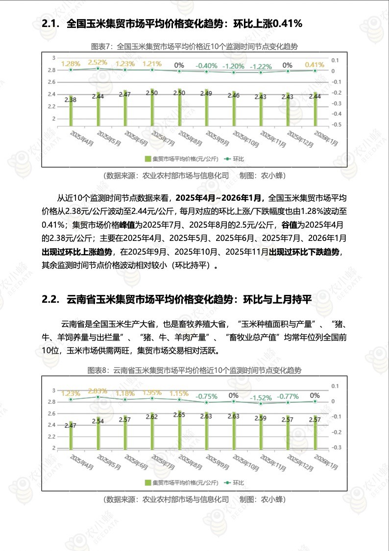 从近10个监测时间节点数据来看,2025年4月~2026年1月,全国玉米集贸市场平均价格从2.38元/公斤波动至2.44元/公斤,每月对应的环比上涨/下跌幅度也由1.28%波动至0.41%;集贸市场价格峰值为2025年7月、2025年8月的2.5元/公斤,谷值为2025年4月的2.38元/公斤;主要在2025年4月、2025年5月、2025年6月、2025年7月、2026年1月出现过环比上涨趋势,在2025年9月、2025年10月、2025年11月出现过环比下跌趋势,其余监测时间节点价格波动相对较小(环比持平)。