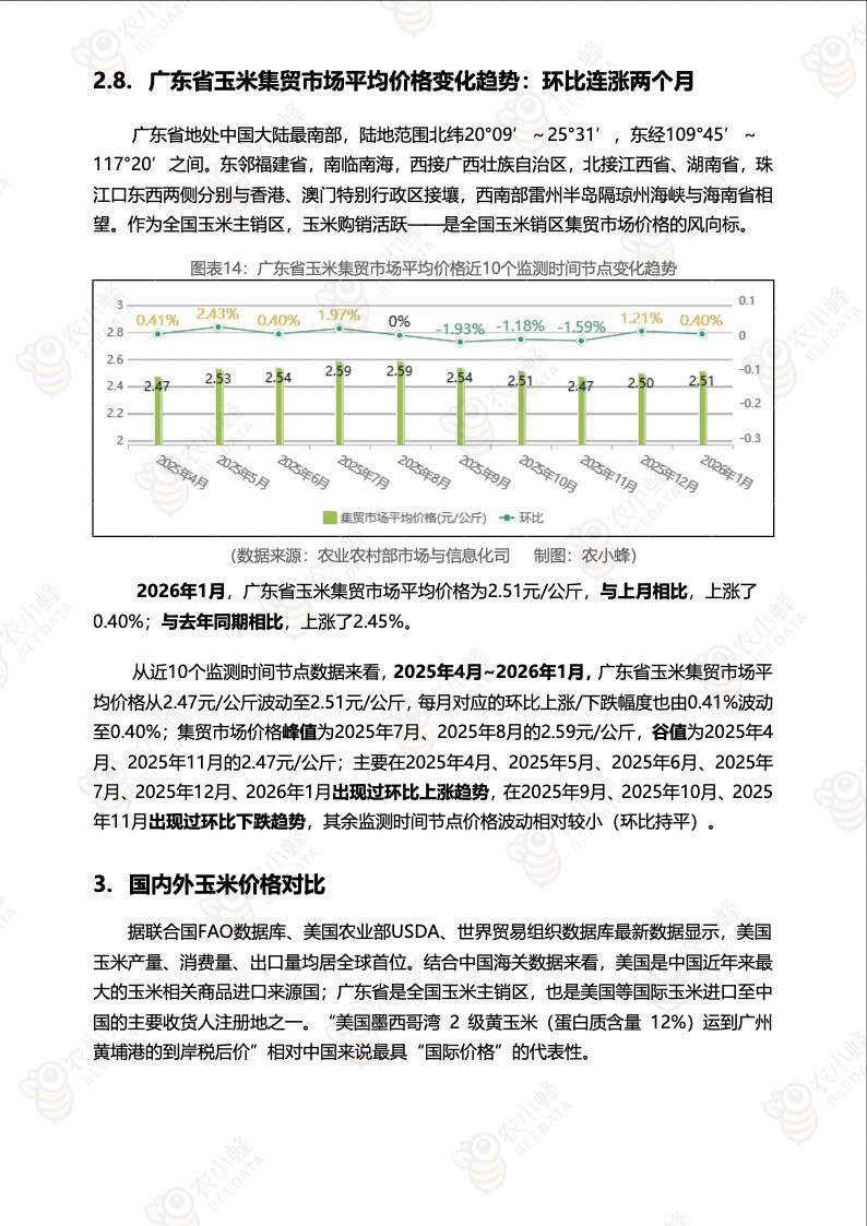 2026年1月,国内东北2等黄玉米运到广州黄埔港的平仓价为2.42元/公斤,与上月相比,基本持平;与去年同期相比,上涨了12.04%;较国际价格高出0.28元/公斤。