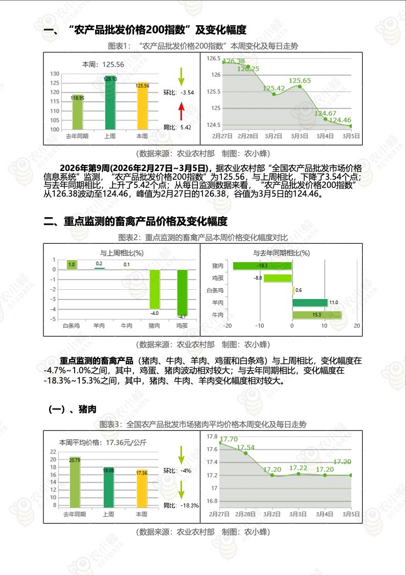 2026年第9周(2026年2月27日~3月5日),据农业农村部“全国农产品批发市场价格信息系统”监测,“农产品批发价格200指数”为125.56,与上周相比,下降了3.54个点;与去年同期相比,上升了5.42个点;从每日监测数据来看,“农产品批发价格200指数”从126.38波动至124.46,峰值为2月27日的126.38,谷值为3月5日的124.46。