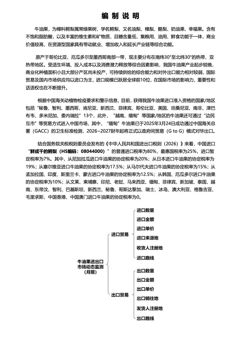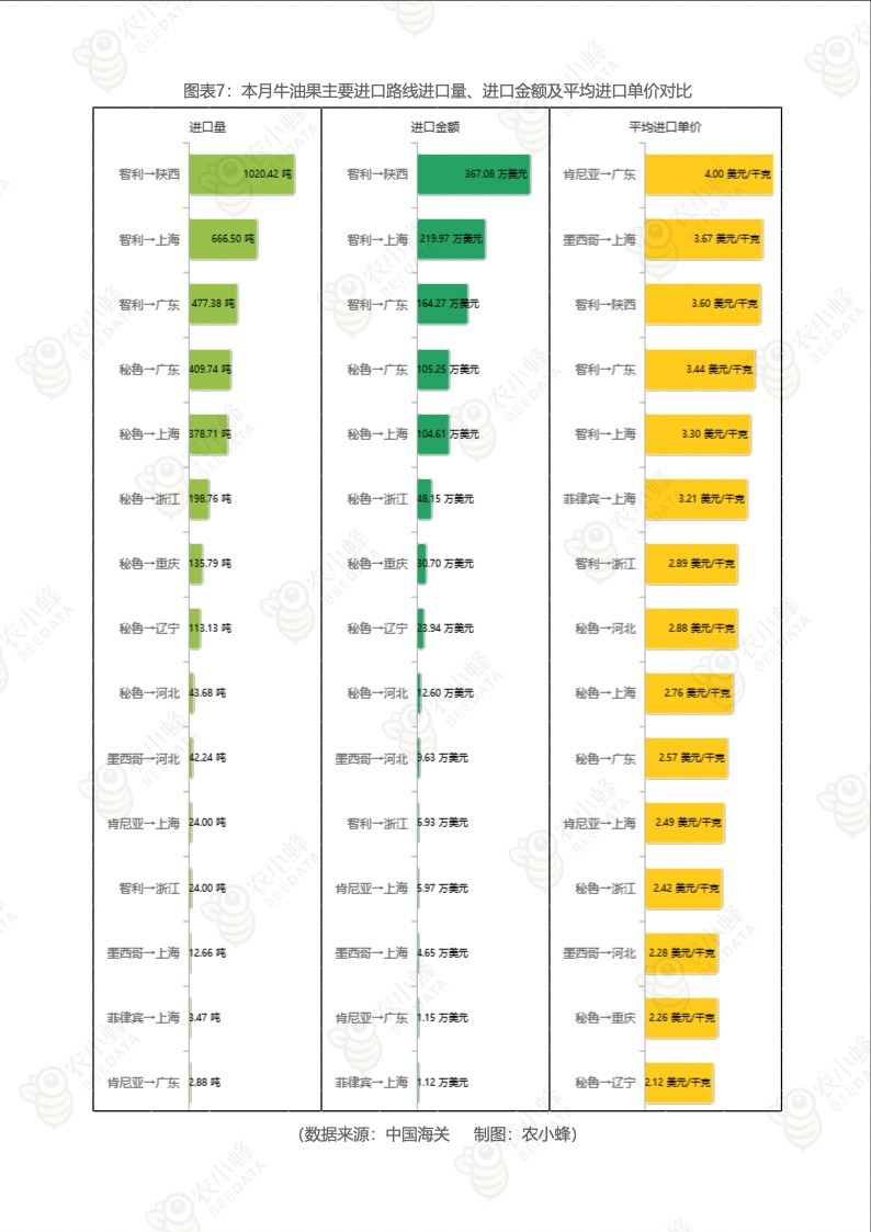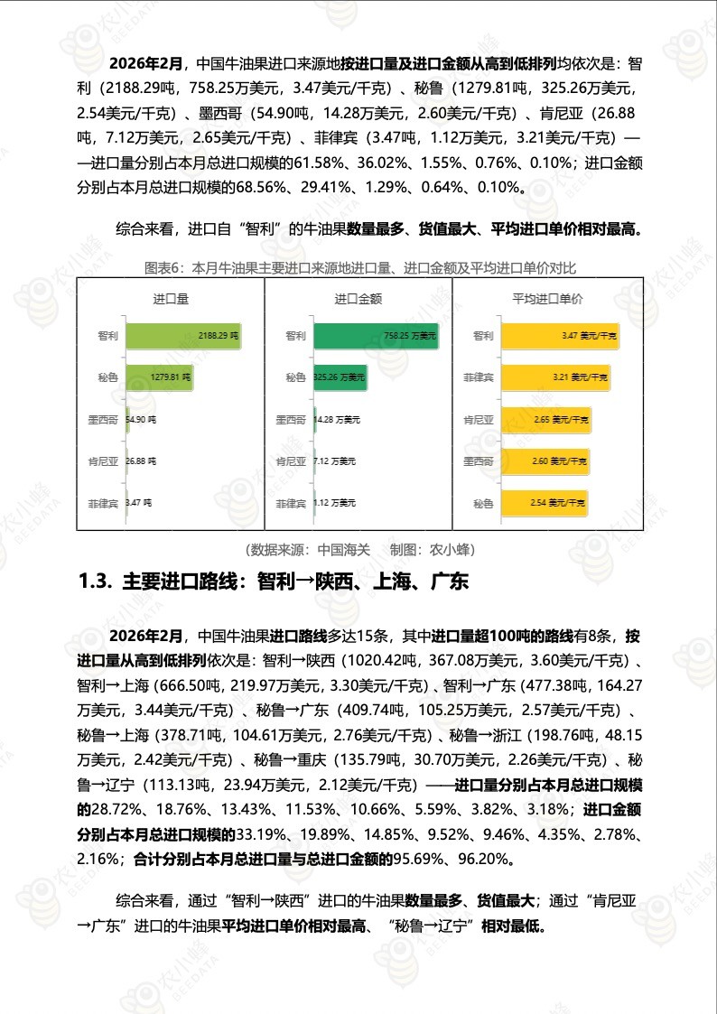 2026年2月,中国牛油果进口路线多达15条,其中进口量超100吨的路线有8条,按进口量从高到低排列依次是:智利→陕西(1020.42吨,367.08万美元,3.60美元/千克)、智利→上海(666.50吨,219.97万美元,3.30美元/千克)、智利→广东(477.38吨,164.27万美元,3.44美元/千克)、秘鲁→广东(409.74吨,105.25万美元,2.57美元/千克)、秘鲁→上海(378.71吨,104.61万美元,2.76美元/千克)、秘鲁→浙江(198.76吨,48.15万美元,2.42美元/千克)、秘鲁→重庆(135.79吨,30.70万美元,2.26美元/千克)、秘鲁→辽宁(113.13吨,23.94万美元,2.12美元/千克)——进口量分别占本月总进口规模的28.72%、18.76%、13.43%、11.53%、10.66%、5.59%、3.82%、3.18%;进口金额分别占本月总进口规模的33.19%、19.89%、14.85%、9.52%、9.46%、4.35%、2.78%、2.16%;合计分别占本月总进口量与总进口金额的95.69%、96.20%。