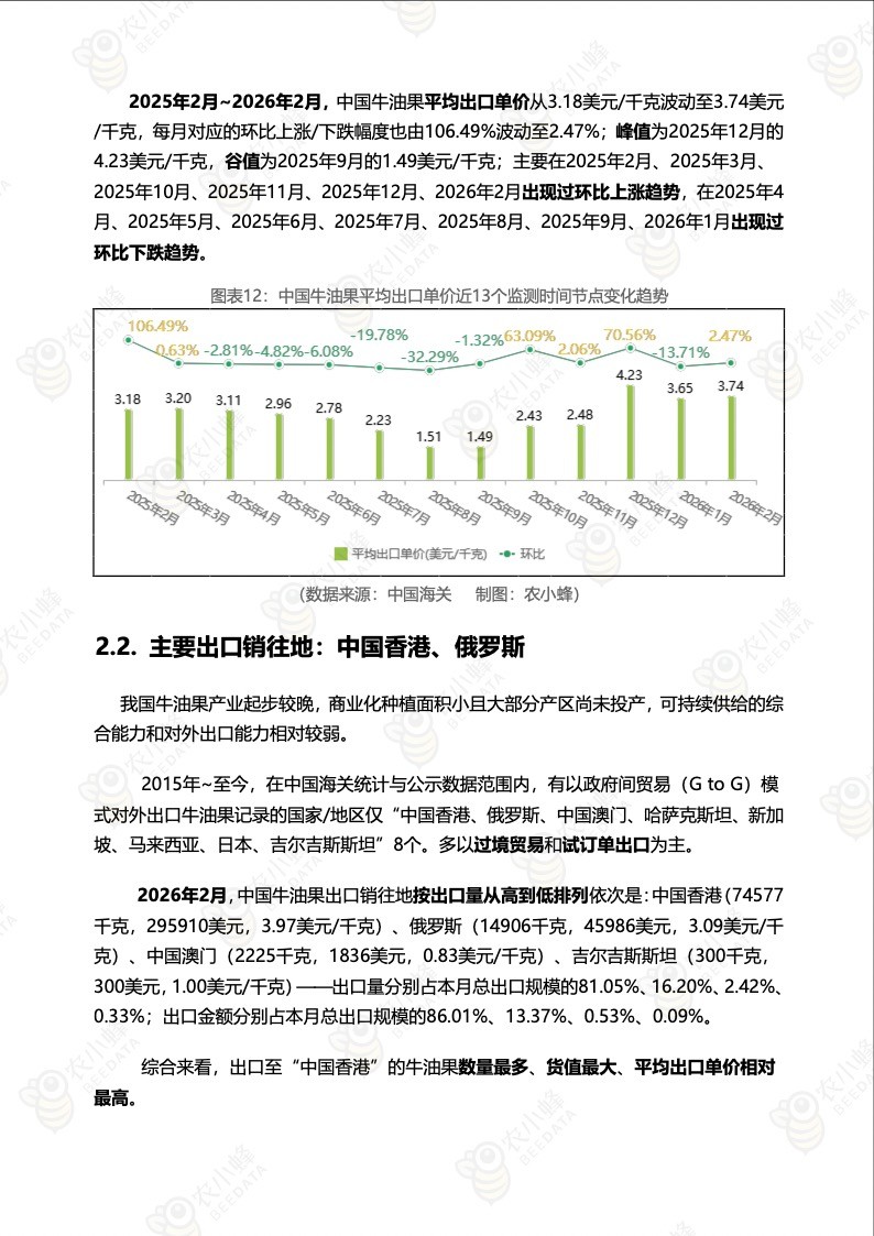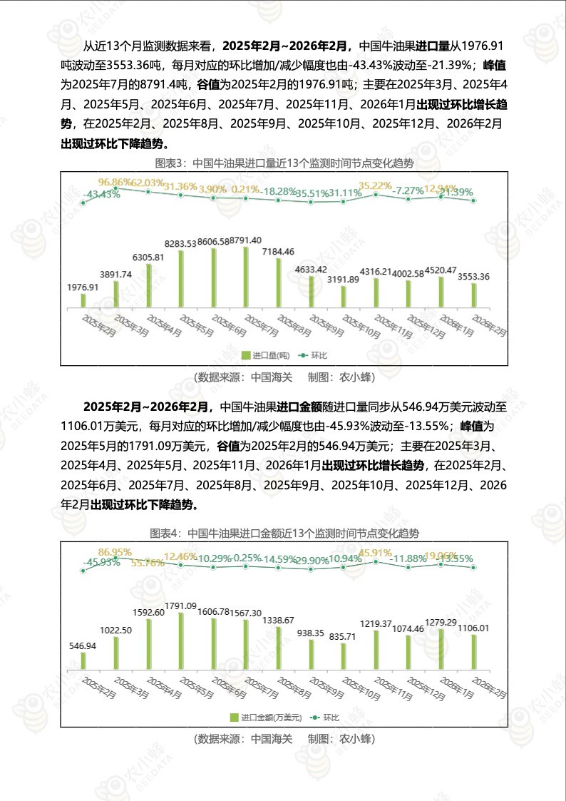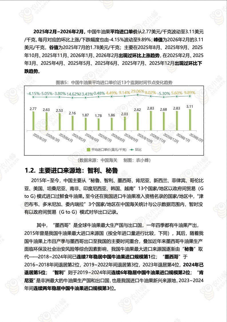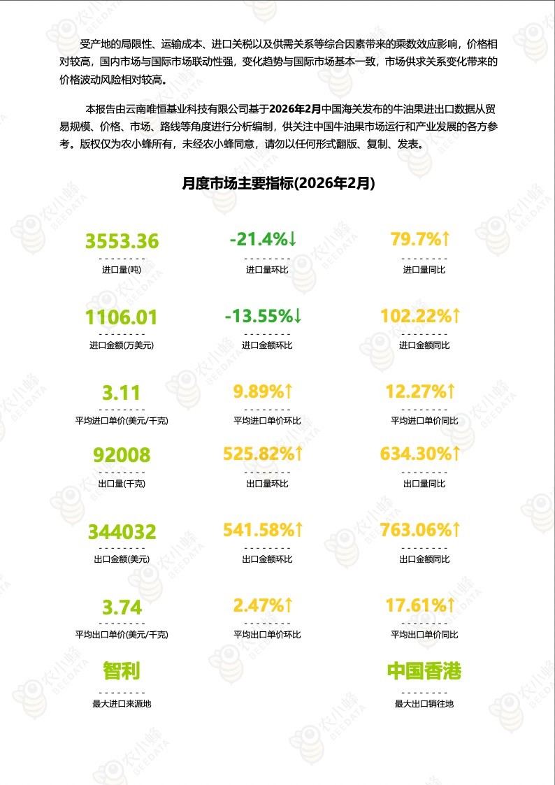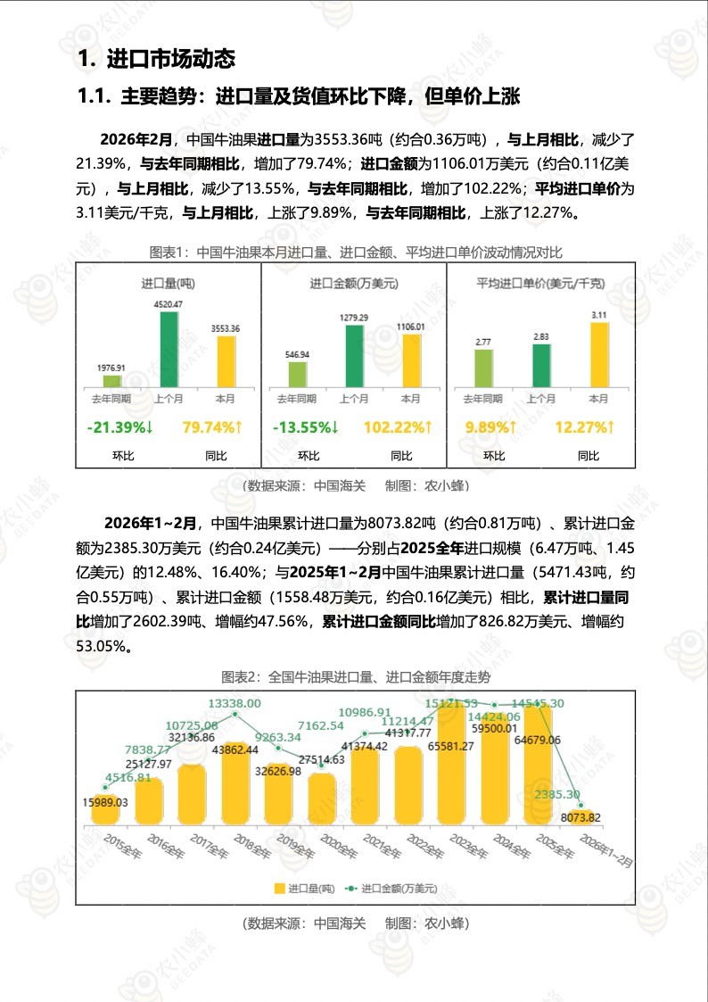 2026年2月,中国牛油果进口量为3553.36吨(约合0.36万吨),与上月相比,减少了21.39%,与去年同期相比,增加了79.74%;进口金额为1106.01万美元(约合0.11亿美元),与上月相比,减少了13.55%,与去年同期相比,增加了102.22%;平均进口单价为3.11美元/千克,与上月相比,上涨了9.89%,与去年同期相比,上涨了12.27%。