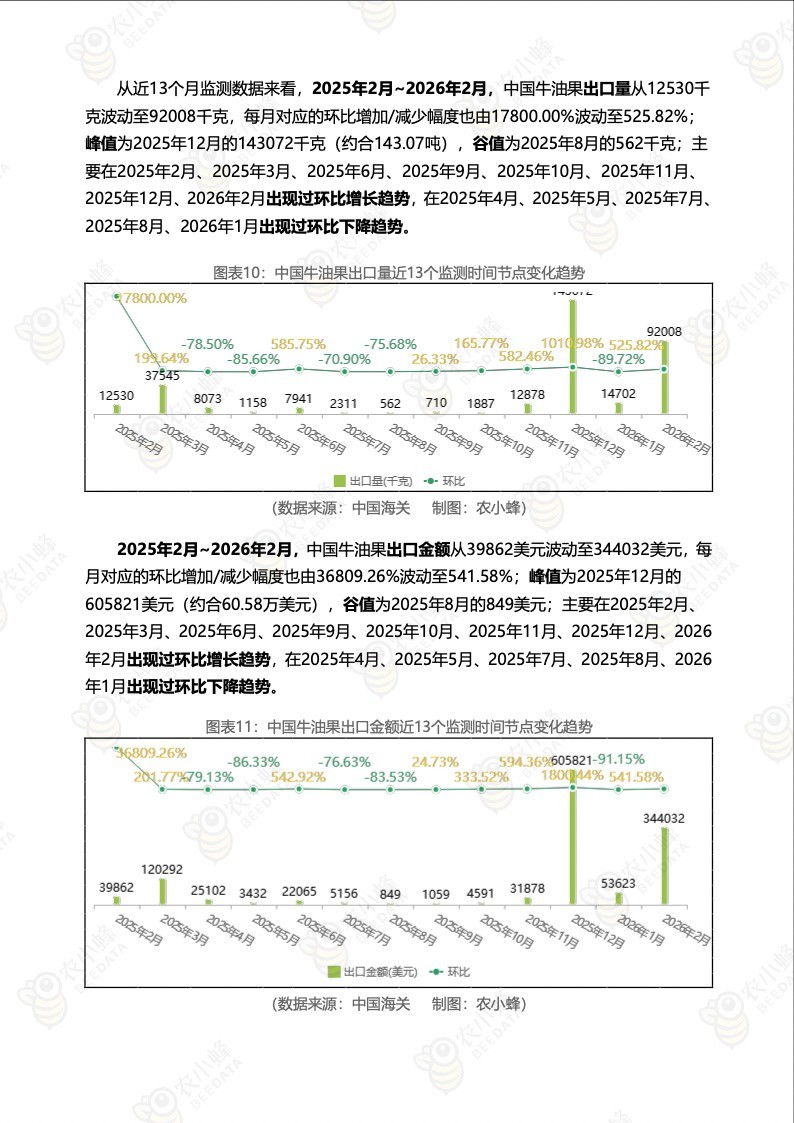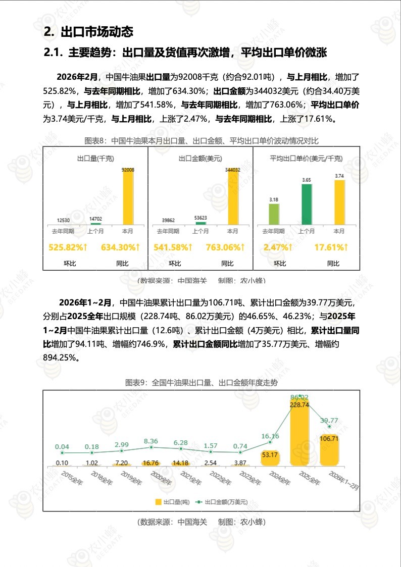 2026年2月,中国牛油果出口量为92008千克(约合92.01吨),与上月相比,增加了525.82%,与去年同期相比,增加了634.30%;出口金额为344032美元(约合34.40万美元),与上月相比,增加了541.58%,与去年同期相比,增加了763.06%;平均出口单价为3.74美元/千克,与上月相比,上涨了2.47%,与去年同期相比,上涨了17.61%。