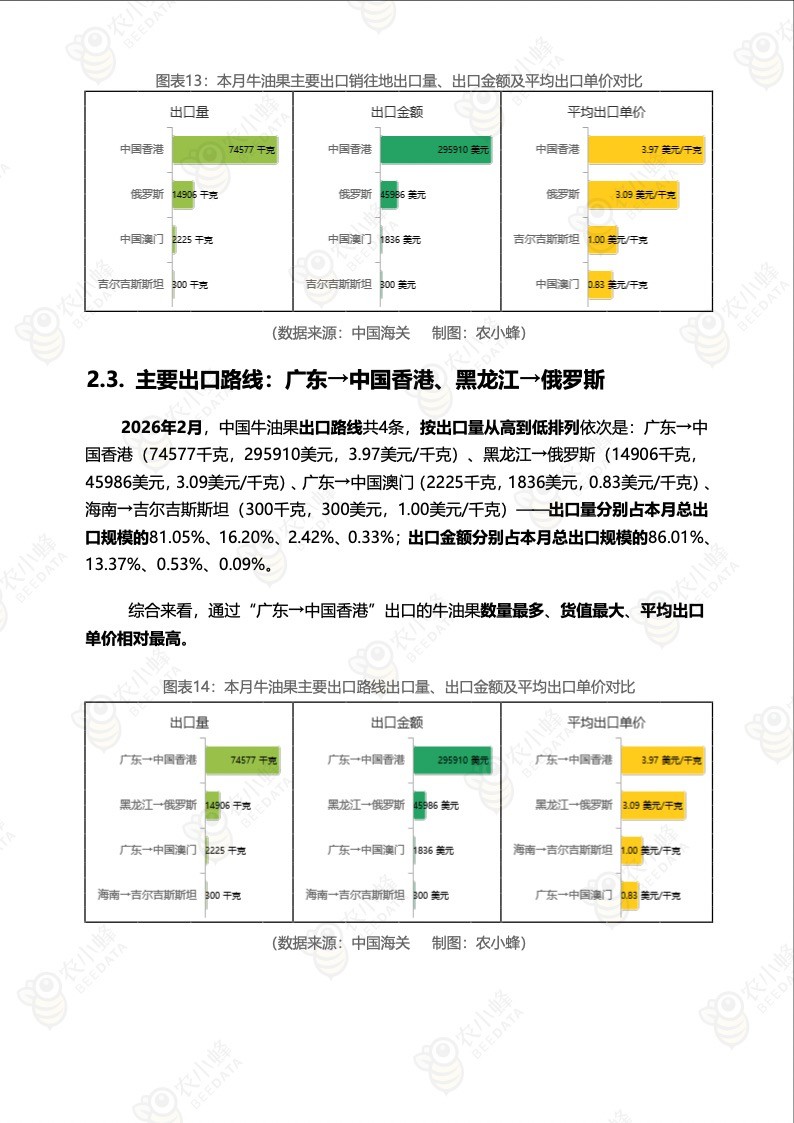 2026年2月,中国牛油果出口路线共4条,按出口量从高到低排列依次是:广东→中国香港(74577千克,295910美元,3.97美元/千克)、黑龙江→俄罗斯(14906千克,45986美元,3.09美元/千克)、广东→中国澳门(2225千克,1836美元,0.83美元/千克)、海南→吉尔吉斯斯坦(300千克,300美元,1.00美元/千克)——出口量分别占本月总出口规模的81.05%、16.20%、2.42%、0.33%;出口金额分别占本月总出口规模的86.01%、13.37%、0.53%、0.09%。